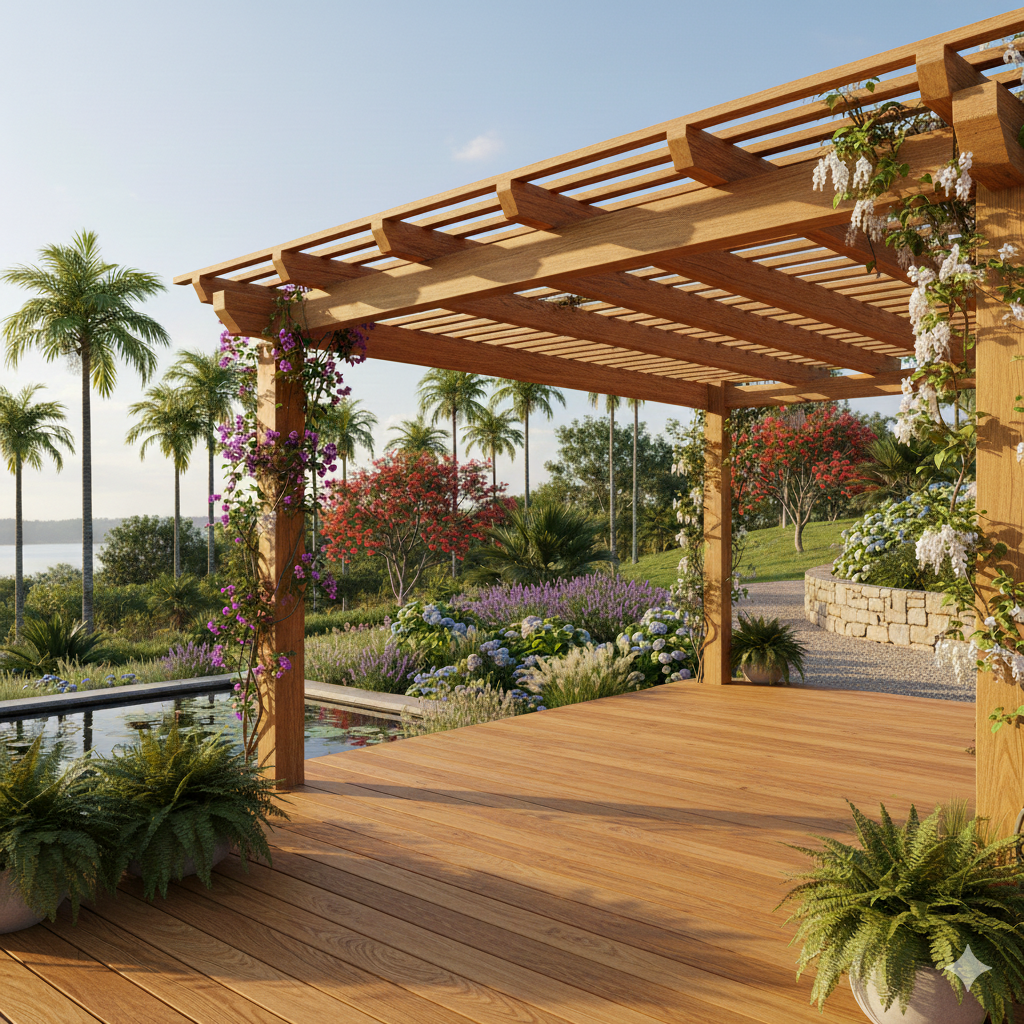 Pergolados, decks e degraus de escada em madeira de lei, com alta resistência e durabilidade.